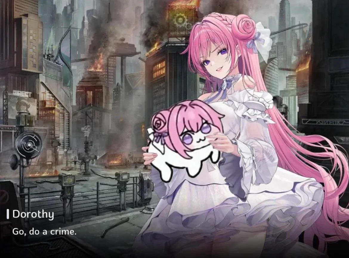 Doro / Dororong is loosely based on Dorothy from the Goddess of Victory: Nikke video game. Nikke is a gacha game featuring behind the back (emphasis on the behind) shooter gameplay following the story of a world where Raptures have taken over Earth, forcing humanity underground and to rely on cyborg soldiers called Nikke to defend themselves and retake the surface. The game first released in July of 2022. I had heard about it at that point but just thought of it as the gacha game that puts the most emphasis on butts (based). Eventually I picked up the game in December of 2022 after hearing even some people I know praise the game’s story and character writing. And they were right; I became a big fan of the series soon after. I do not play it consistently at this point, but I pop back in and play for a bit every few months or so. The game really picked up this Summer, with said events in the Summer inspiring me to put this deep dive on Doro together. We’ll get into the summer event later. Part of what makes Doro funnier for people who know Nikke is her contrast with Dorothy. Dorothy has a very serious role in the story and is a very dramatic character. Nikke does genuinely have great writing when it comes to the story and Dorothy contributes heavily to that. So out of all of the characters in Nikke that could have become a fan meme character, she is the least fitting in canon. But that juxtaposition just makes it better from a meta standpoint.