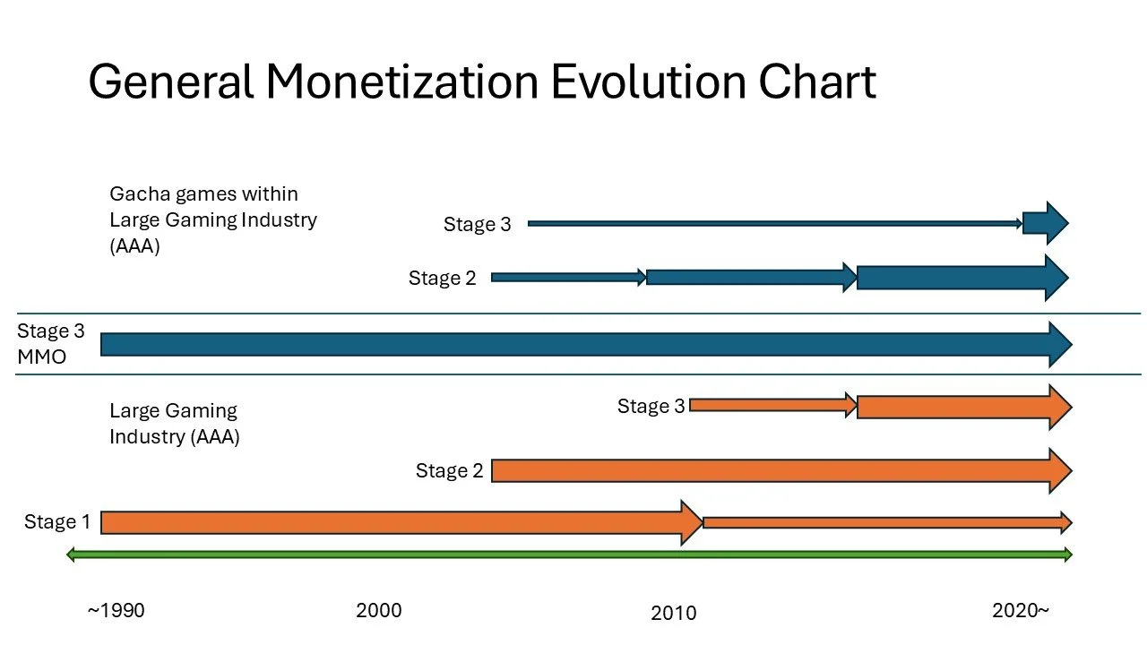 Chart 1: A general evolution of monetization systems of large-scale games (AAA companies). This does not include individual developer games. This is based on releases or systems from notable games (AAA games in news sources) from a general and relative perspective. Times are not exact and level of severity by arrow widths and severity may not include all games within the industry.